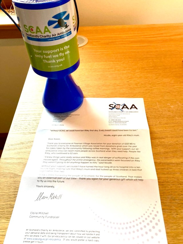 We recently learned that the last SCAA collecting can that was returned to the charity earlier this year contained an amazing £227.83! This means the good folk of Fearnan have been quietly popping not just small change, but also fivers, tenners and twenty-pound notes into the can during our regular events in the Hall. You know who you are! Thank you!
