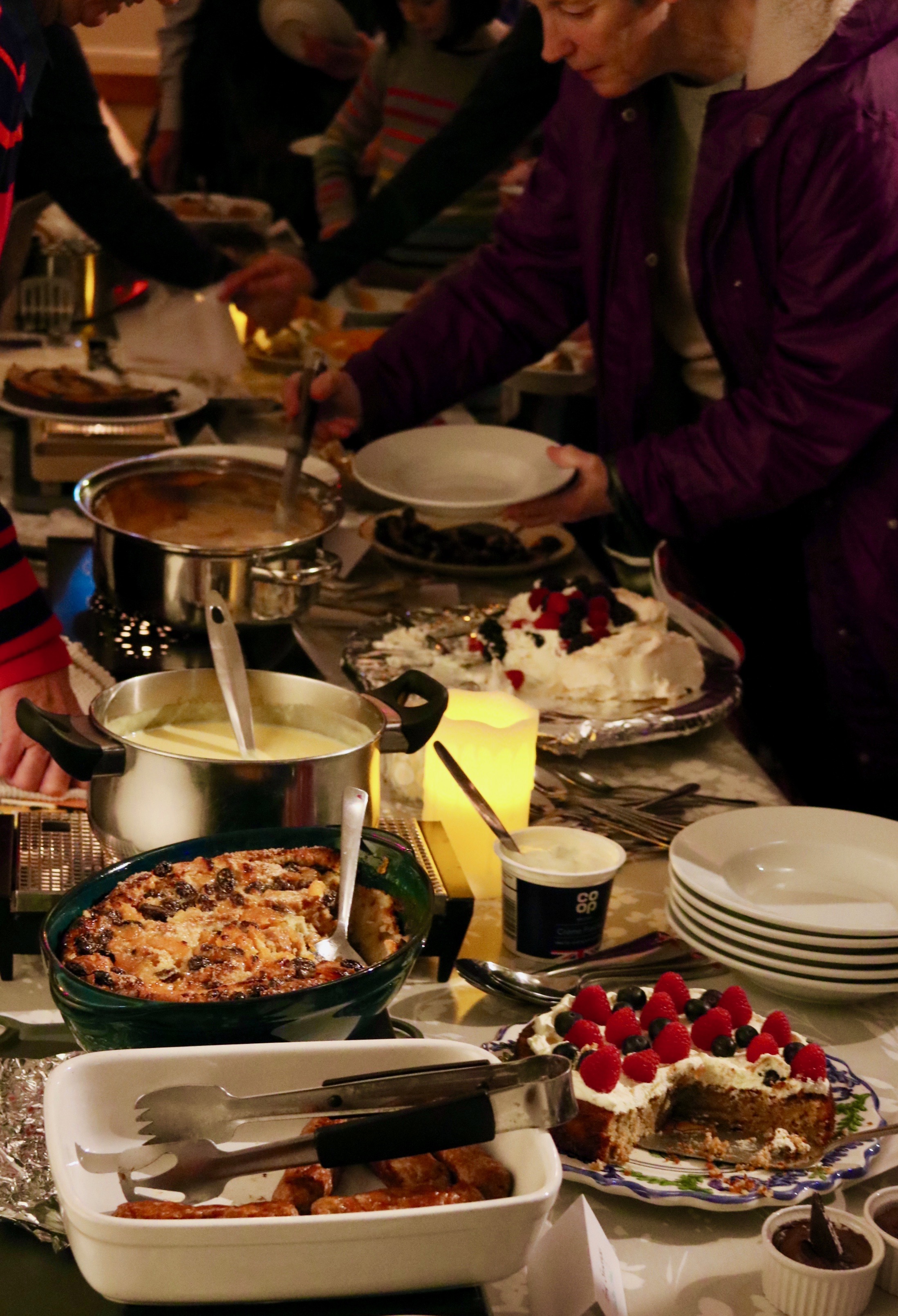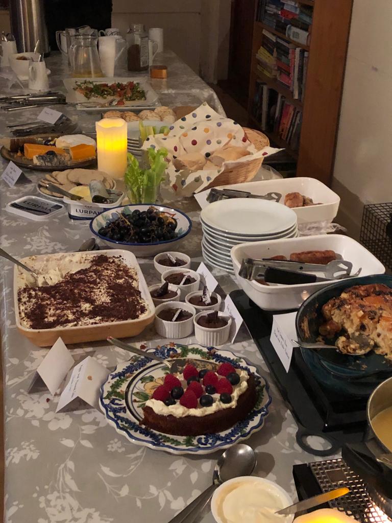 This year, we introduced a table of savouries in order to cater for all tastes, so there were flans, sausages and cheese and biscuits alongside the meringues, steamed puddings, mousses and tarts. We don’t think anyone ended up with a sausage on the same plate as their rice pudding but, with the lights dimmed, it was a close run thing on a couple of occasions.