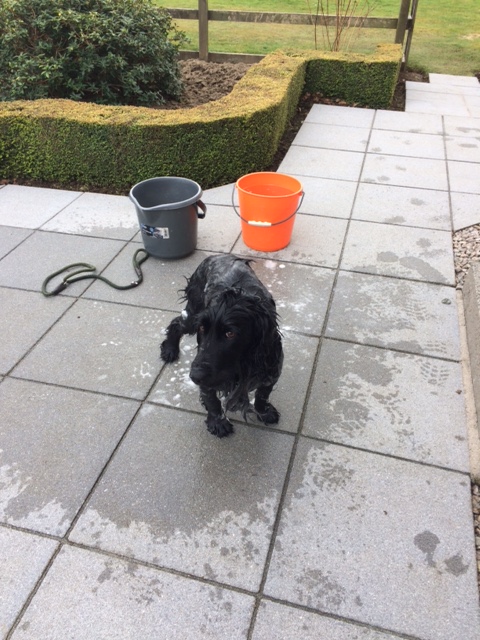 Steve is a designate key worker because of the Hydro Schemes and is out and about doing maintenance. He was, however, captured hard at work at home at the weekend and although he appears to be in the doghouse, he is in fact cleaning it. And afterwards the dogs got cleaned as well (not hugely appreciated by all of them, judging by their expressions).