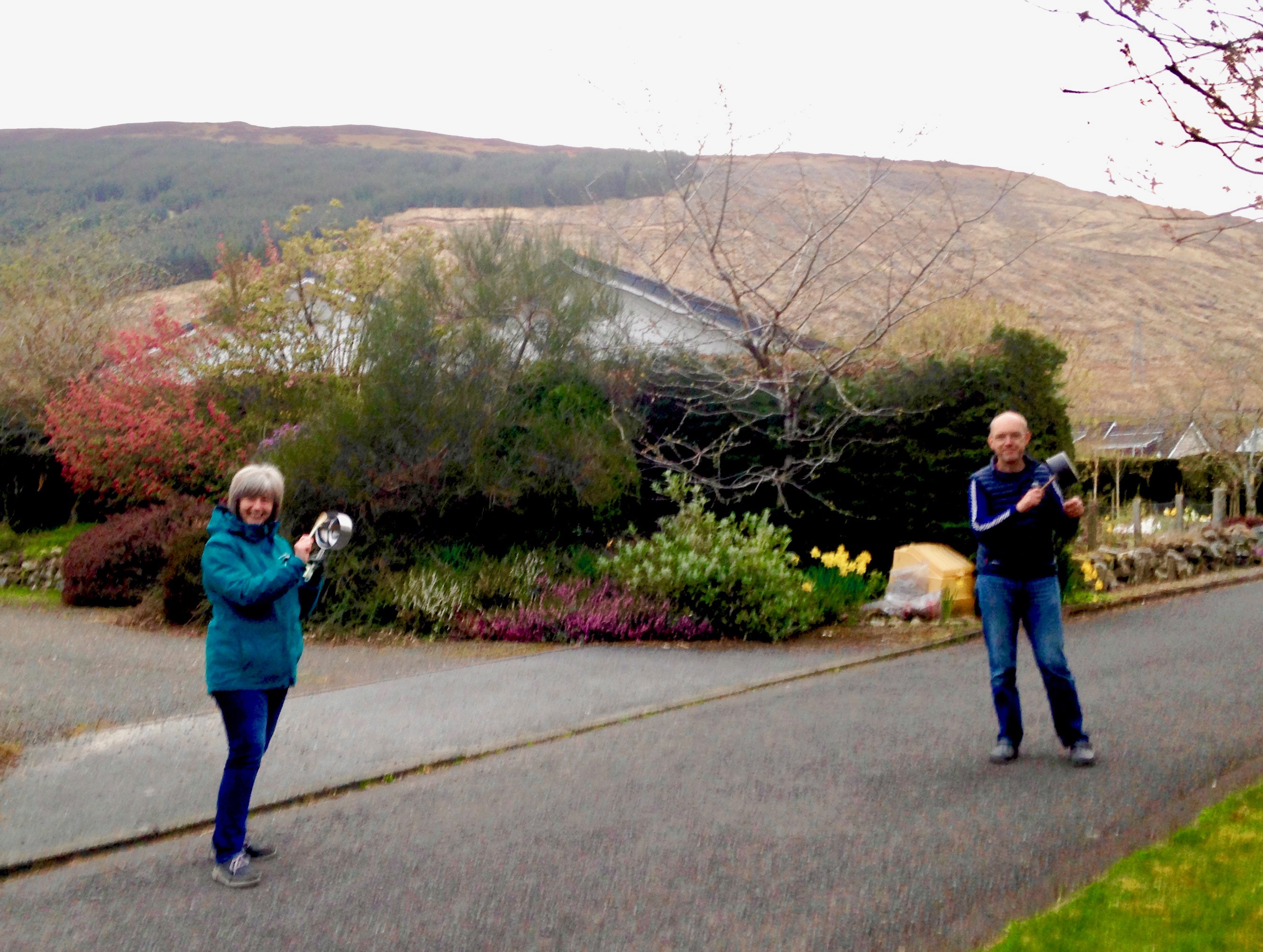 Fearnan has been taking an enthusiastic part in the national Clapping for Carers initiative every Thursday evening. Much ingenuity has been employed to find implements and instruments to make as much noise as possible but, with the village being so spread out, it is not easy to get a single photo that conveys the level of participation. But we can bring things together on the Blog, so here is a selection of last nights participants: