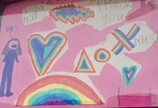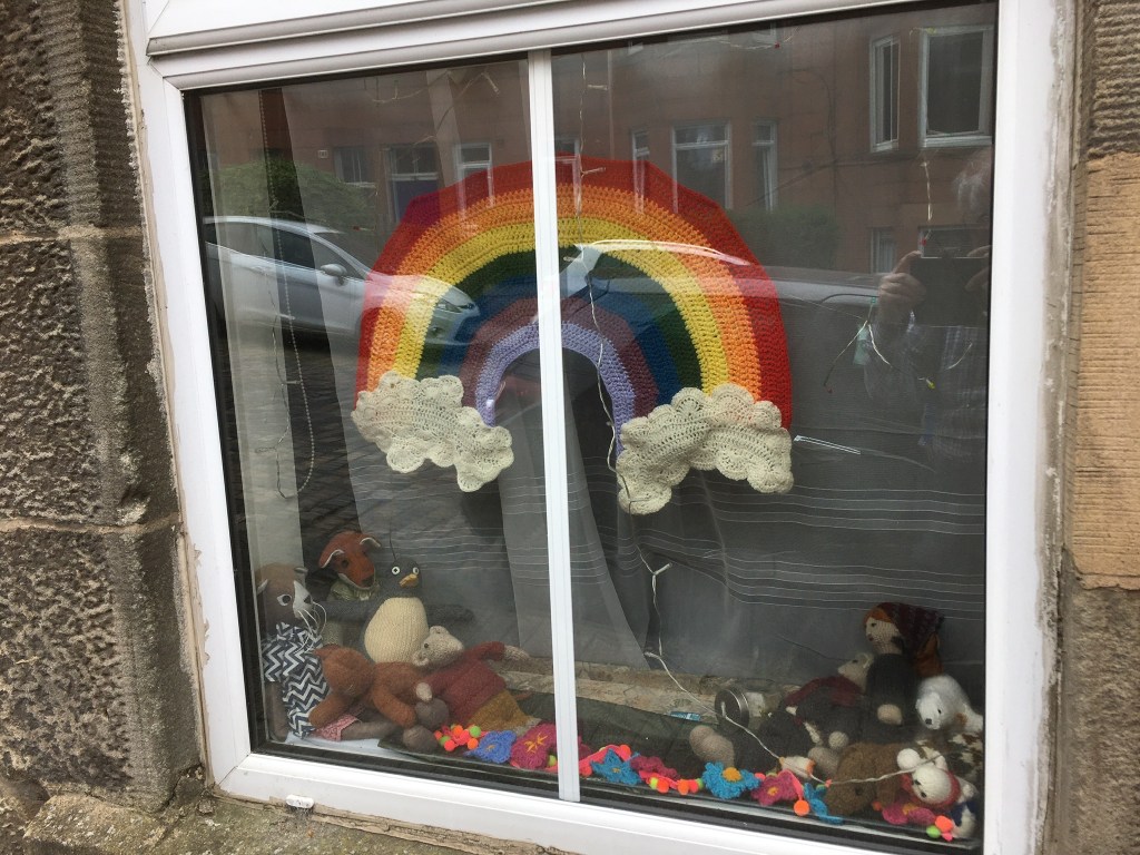 Cath sewed a banner and we also have rainbows, including a fine and rare example of pedi-art, ingeniously created by baby Drummond (with a little sisterly help) as part of a home school art lesson! Both Enya and Drummond’s pictures are on display in the window at the Kenmore Post Office.