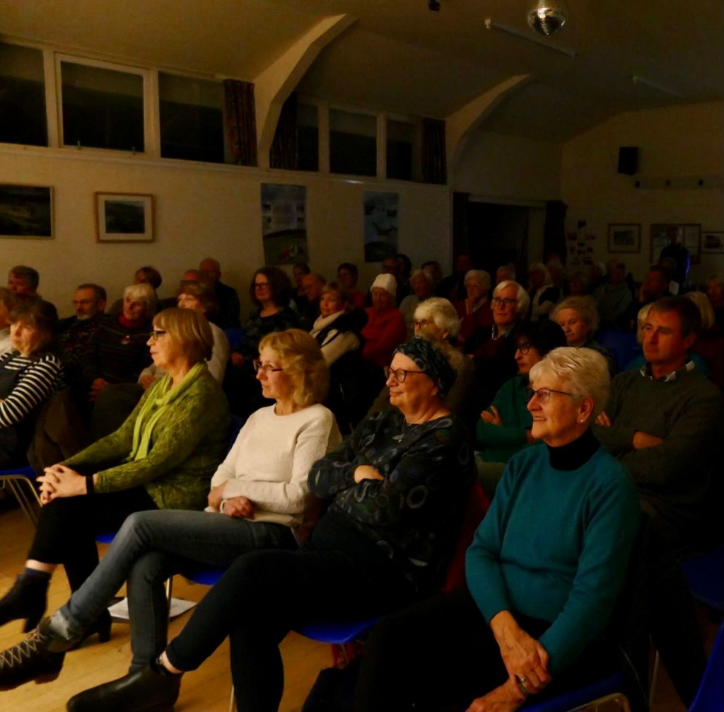 “A packed McLean Hall, Fearnan, was thoroughly entertained and stimulated at an evening with internationally renowned author, Ann Cleeves, whose crime fiction novels and their television adaptations have thrilled millions of people in over thirty translations across the world. Last Tuesday evening (18th October), a light-hearted conversation with her friend, James Grieve, Emeritus Professor in Forensic Medicine, Aberdeen University, whose associations with Fearnan and Kenmore extend over half a century, the audience learned about how Ann crafts her Shetland, Vera and, now, Matthew Venn novels, all with such specific and distinct geographical settings from which her characters emerge, writing more or less daily in the early morning, to produce a novel each year, and her positive views about the television series which her characters have inspired.