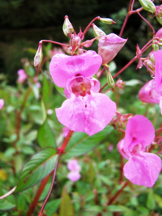 Himalayan balsam has large, pink flowers shaped like a bonnet; these are followed by hanging, green seed pods.