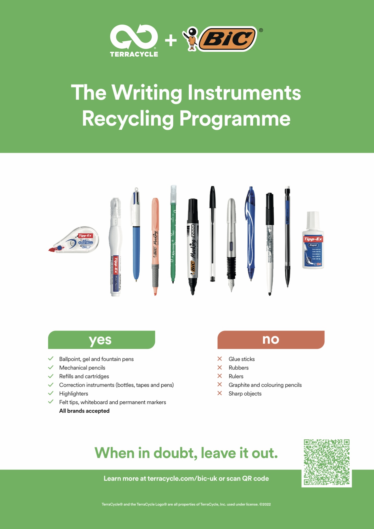 Accepted waste: all brands of writing instruments, whether in plastic or metal – ballpoint, gel and fountain pens, marker pens, mechanical pencils, refills and cartridges, eraser pens (cap included), correction instruments (bottles, tapes and pens), highlighter, felt tips, whiteboard and permanent markers.
