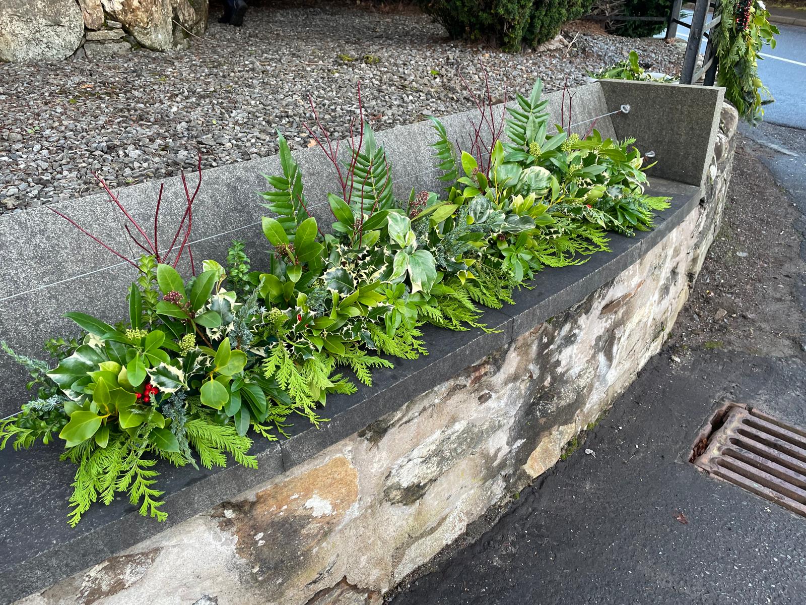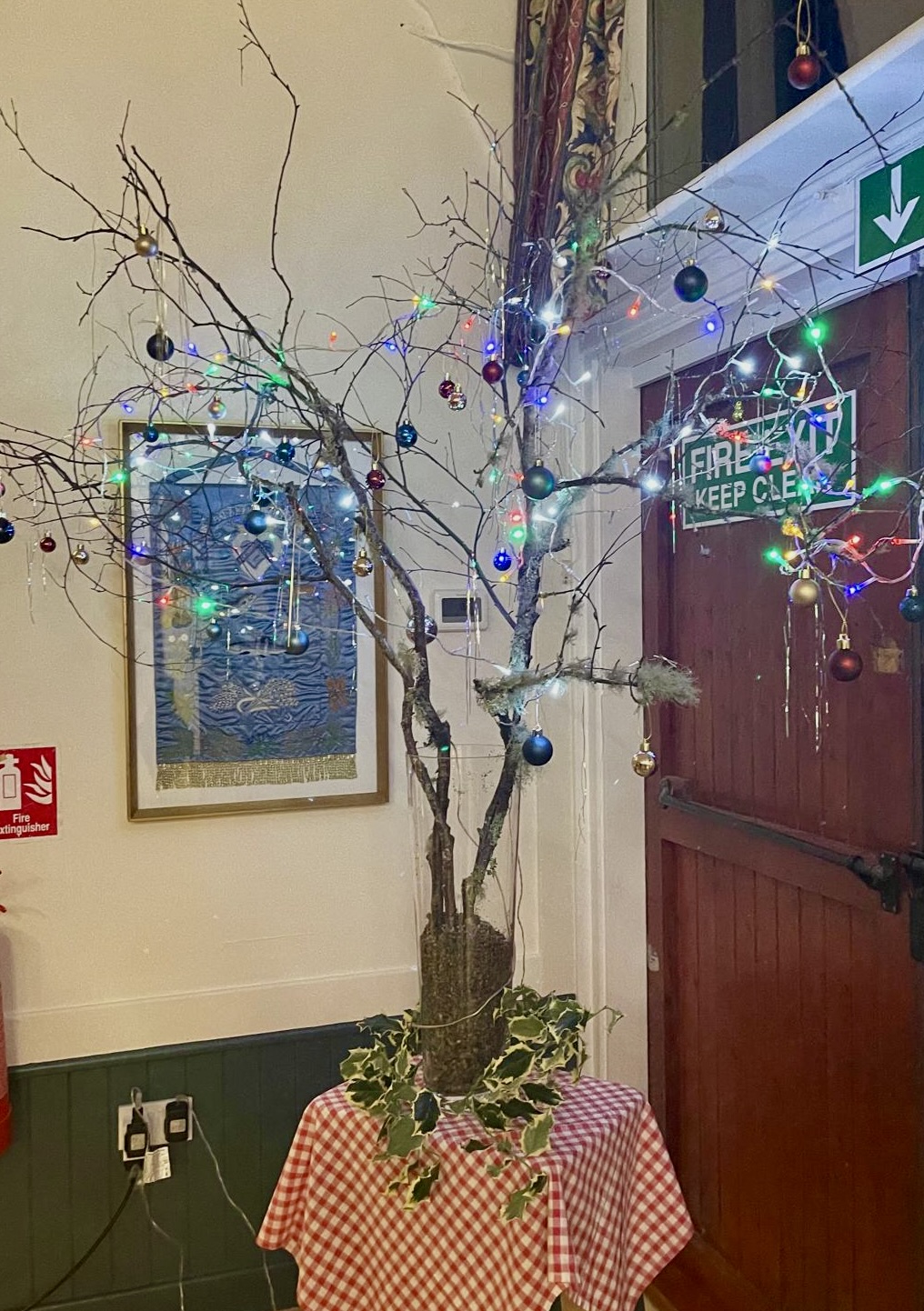 The Christmas lights went up on the tree at the Hall just before the Mulled Wine event (thank you to John and Neil) and this year, for the first time, Cath and Linda installed some Christmas greenery and a seasonal arrangement at the War Memorial.